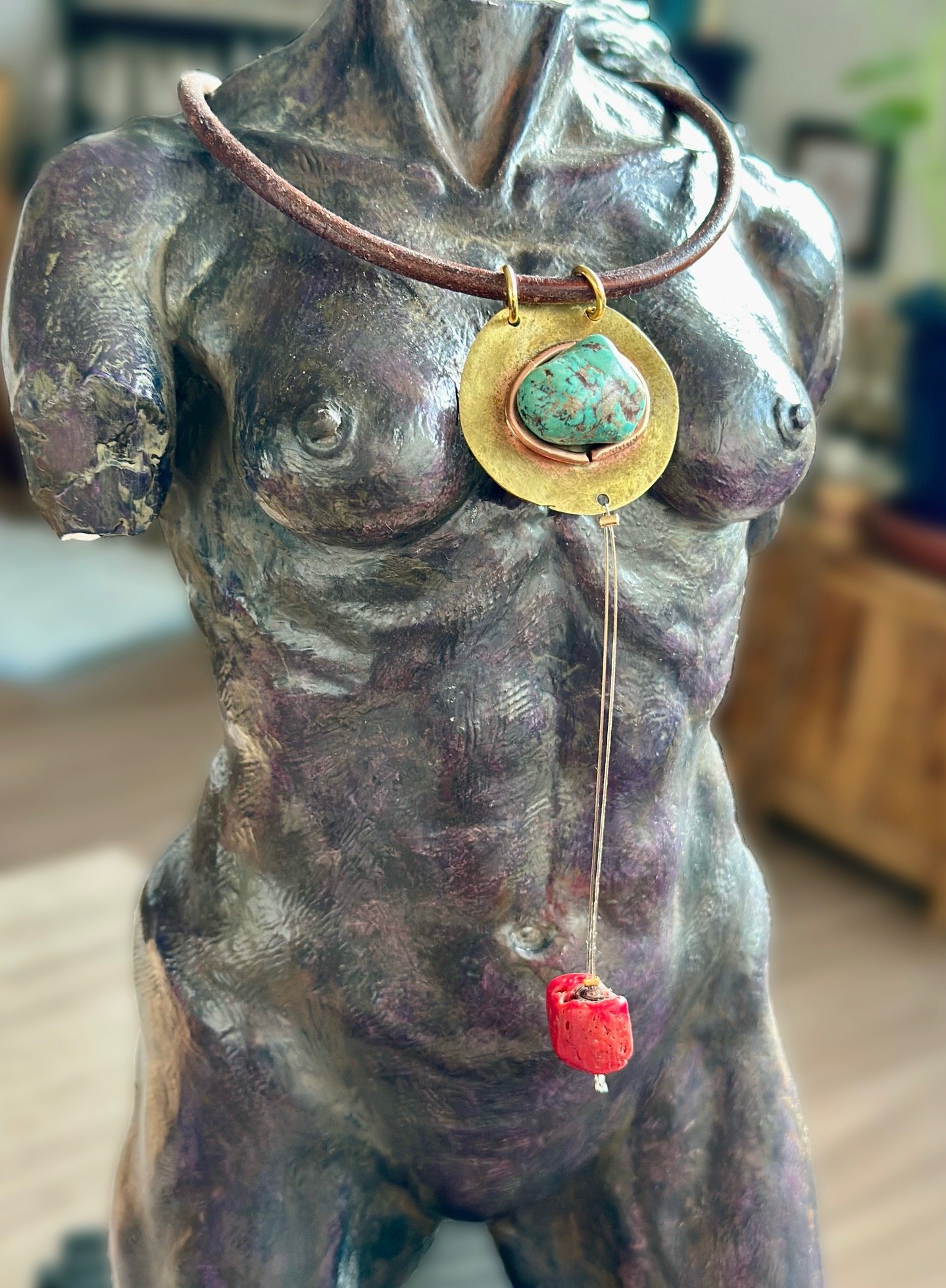 Leather, copper, brass, turquoise and coral necklace
