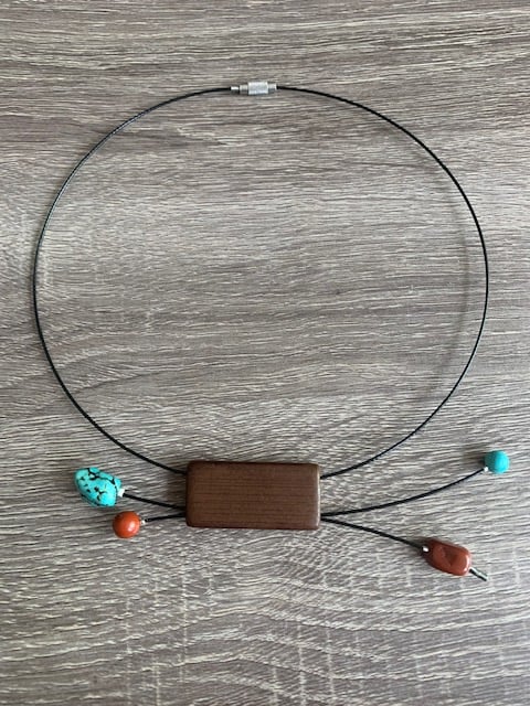 I made this sculptural necklace with wood, stones, turquoise and wire.