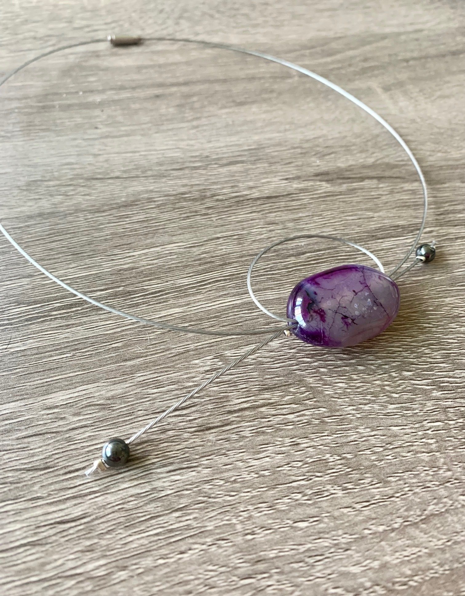 I made this sculptural necklace with wood, amethyst, semi-precious stones, and wire.