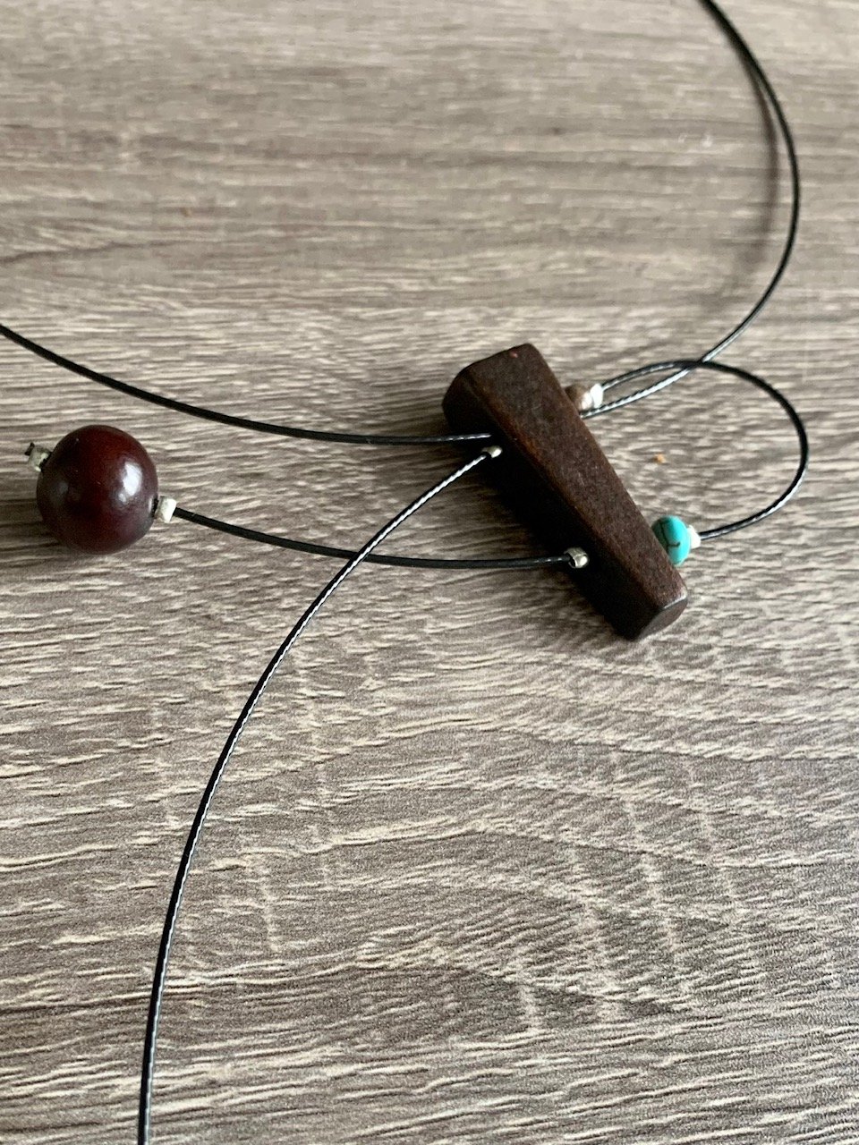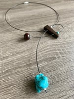 I made this sculptural necklace with wood, turquoise, and wire.